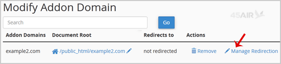 3. Under "Modify Addon Domain", locate the addon domain and click on "Manage Redirection".