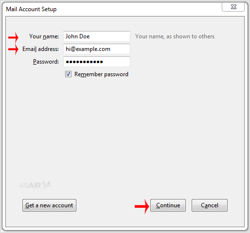 4. In Mail Setup Account, fill out your name, full email address like "yourname@example.com", and the password of your email account. Then click on "Continue".